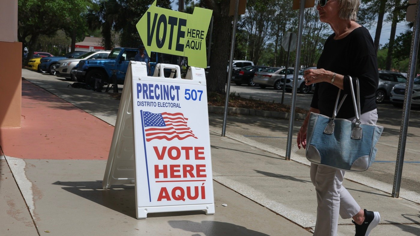 An indication directs voters to solid their ballots on April 1 at a polling station arrange on the Flagler County Public Library in Palm Coast, Fla.