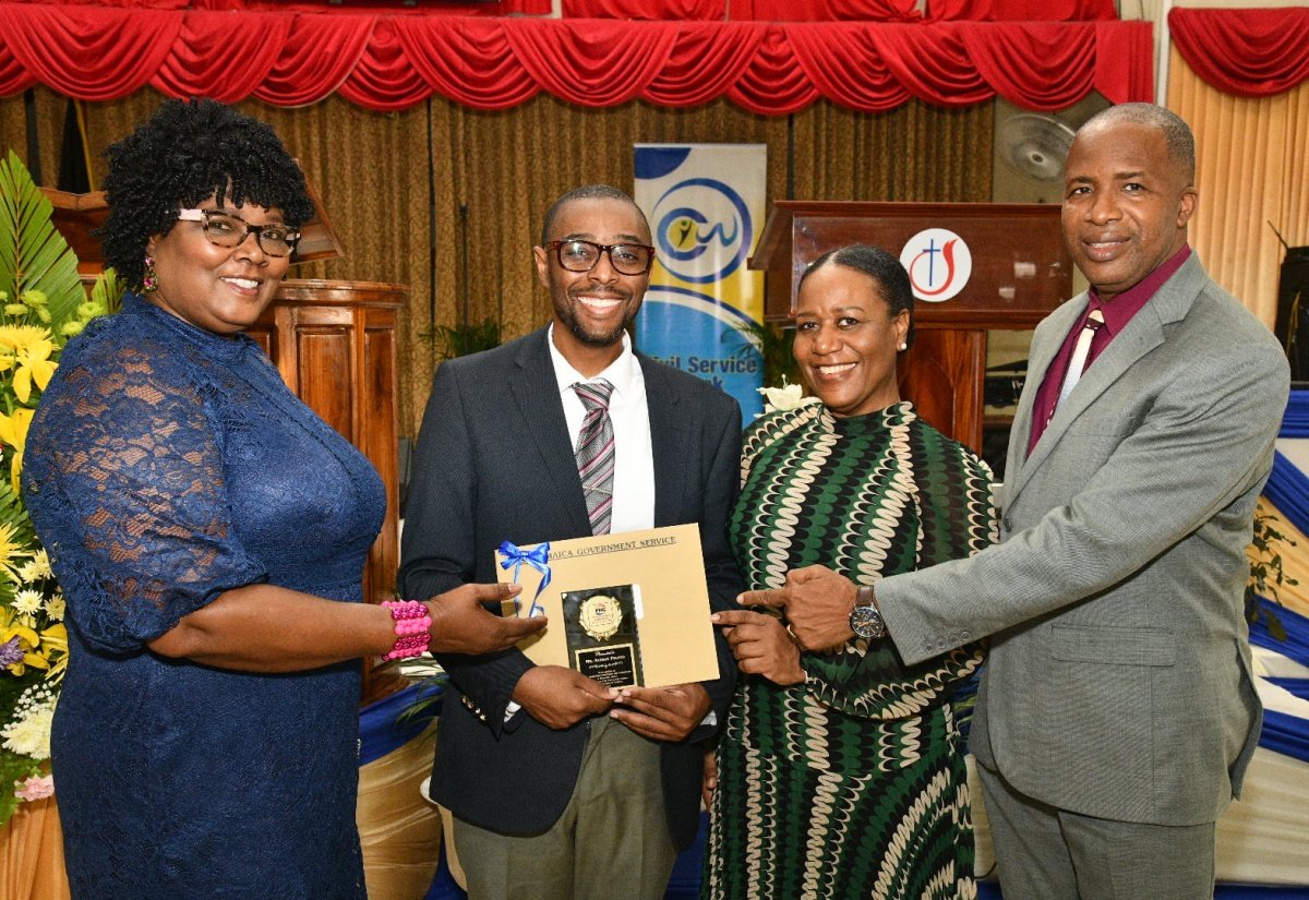 Author and Producer on the Jamaica Data Service (JIS), Andrae Palmer (second left), who’s considered one of 14 finalists for Civil Servant of the 12 months 2025, is congratulated by the JIS staff (from left) Senior Photograph Librarian, Maxine Shrouder; Supervisor, Human Useful resource Administration and Improvement, Julian Tomlinson; and Director, Human Useful resource Administration and Improvement, Dr. David Knight. As a result of impression of Hurricane Melissa, the choice course of for this 12 months’s awards was deserted and all of the finalists have been recognised on the service.