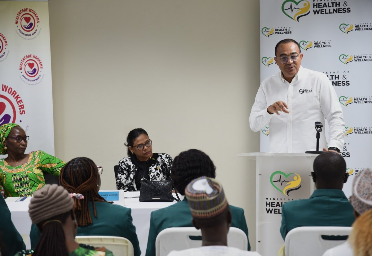 Minister of Well being and Wellness, Dr. the Hon. Christopher Tufton, addresses an introduction and handover ceremony for nurses from the Nigeria Technical Help Corps Programme on Monday (July 7) on the Ministry in New Kingston. Listening (from left) are Chargé d’Affaires, Nigerian Excessive Fee to Jamaica, Bintu Bwala Ekikor; and Chief Medical Officer within the Ministry, Dr. Jacquiline Bisasor-McKenzie. The nurses will be a part of the native well being workforce to spice up human useful resource capability.