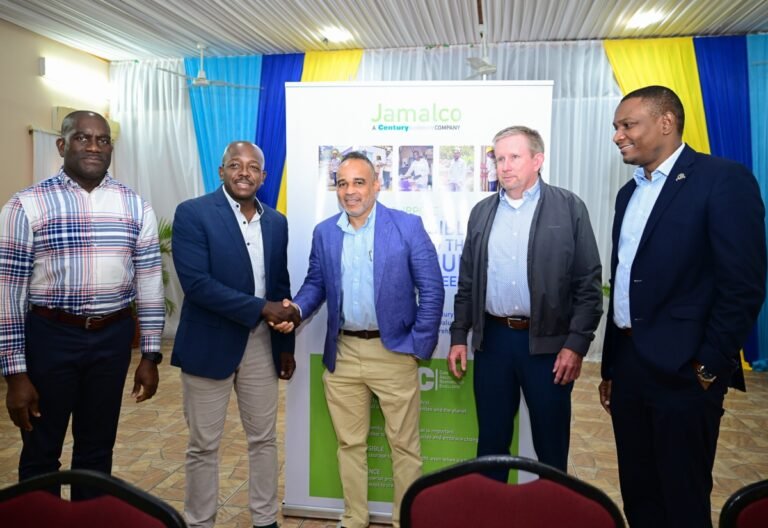Minister of Labour and Social Safety and Member of Parliament for Clarendon South Jap, Hon. Pearnel Charles Jr. (second left), shakes fingers with Managing Director, Jamalco, Marvin Jackson (centre), at Jamalco’s scholarship awards ceremony held on July 30 on the Wembley Centre of Excellence in Hayes, Clarendon. Sharing within the second (from left) are: Director of Human Assets, Company Providers and Safety, Jamalco, Christopher Buckmaster; Vice President of Operations, Americas, Century Aluminium, Levi Chaffin; and President of the Jamaica Lecturers’ Affiliation (JTA), Dr. Mark Smith.