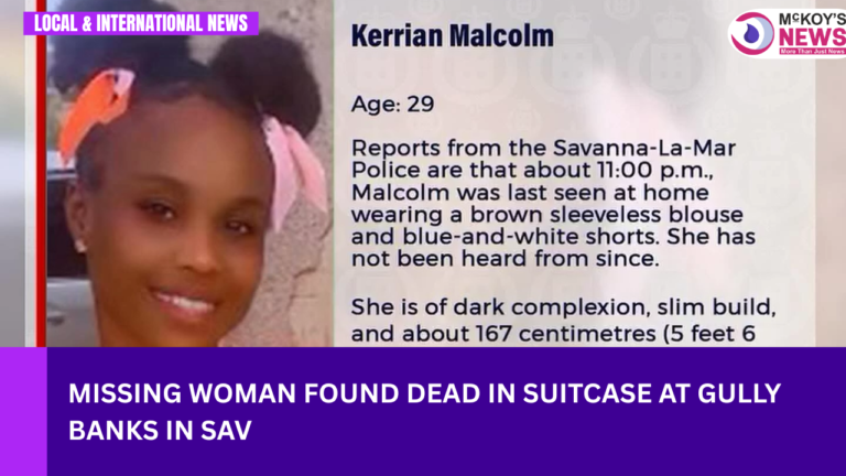 Savanna-la-mar, Westmoreland: Tragic information has emerged from Westmoreland as authorities affirm that 29-year-old Kerrian Malcolm, of Barracks Street, Savanna-la-Mar, has been discovered lifeless. Her physique was reportedly found inside a suitcase dumped at Gully Banks in Savanna-la-Mar.