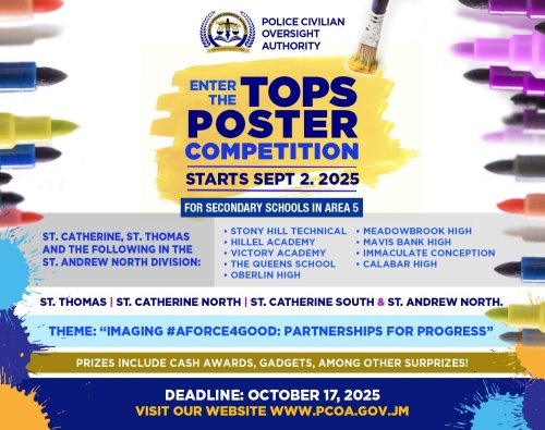 The Police Civilian Oversight Authority (PCOA) is inviting younger creatives from establishments throughout the Jamaica Constabulary Power (JCF) Space 5 to showcase their expertise within the 2025 Remodeling Our Police Service (TOPS) Secondary Faculties Poster Competitors.