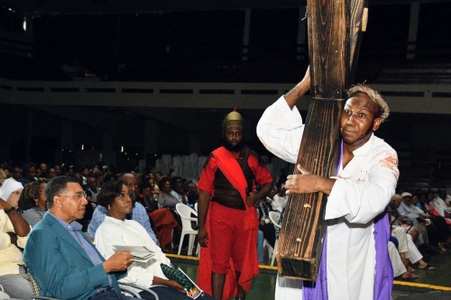 Prime Minister, Dr. the Most Hon. Andrew Holness (left, seated), and his spouse and Speaker of the Home of Representatives, the Most Hon. Juliet Holness (proper, seated), observe an outline of the crucifixion of Jesus, in the course of the Jesus 2025 twenty fifth Jubilee Yr of Hope stage manufacturing on the Nationwide Area on Sunday (September 28). The manufacturing, which runs from September 24 to October 5, is organised by Father Richard HoLung and Pals.