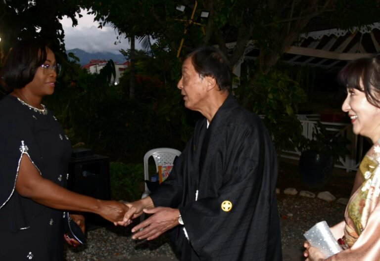 President of the Senate, Senator the Hon. Thomas Tavares-Finson (left), greets Ambassador of Japan to Jamaica, His Excellency Yasuhiro Atsumi. The event was a reception to have a good time the birthday of His Majesty the Emperor of Japan, held on Thursday (February 20) at The Jamaica Pegasus lodge in New Kingston.