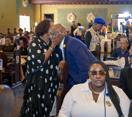 Minister of Tradition, Gender, Leisure and Sport, Hon. Olivia Grange (left), greets Deacon Stafford McCallum, the brother of late Jamaican boxer, Michael McCallum. Event was the thanksgiving service for the lifetime of Mr. McCallum held on the Holy Trinity Cathedral in Kingston on Saturday (Aug. 16).