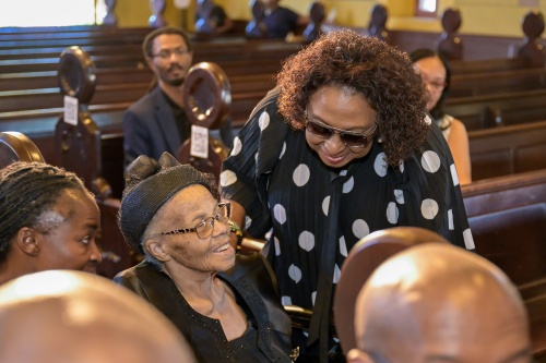 Minister of Tradition, Gender, Leisure and Sport, Hon. Olivia Grange (proper), greets Olive McCallum, the mom of late Jamaican boxer, Michael McCallum. Event was the thanksgiving service for the lifetime of Mr. McCallum held on the Holy Trinity Cathedral in Kingston on Saturday (Aug. 16).